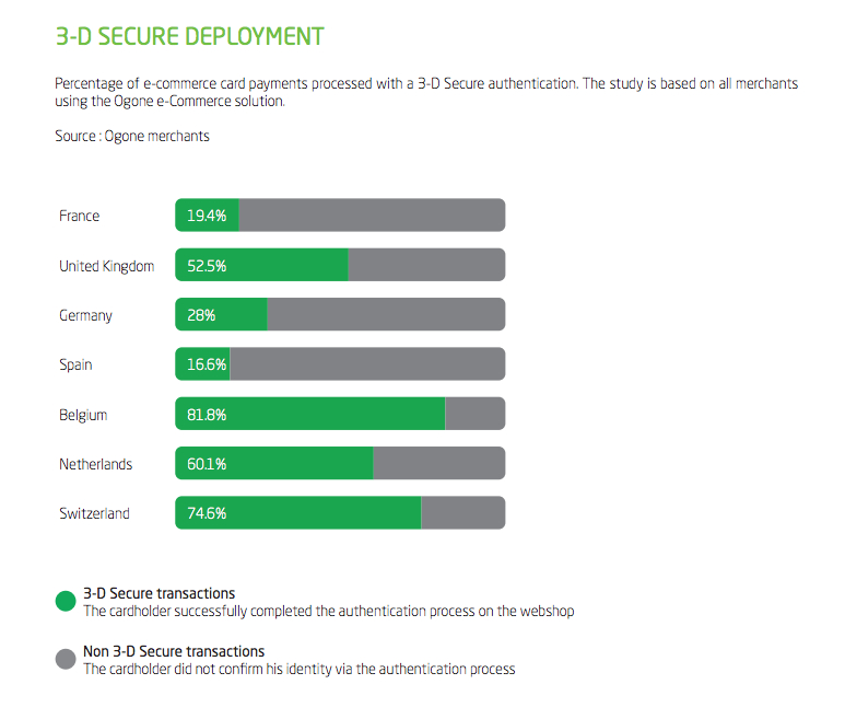 For now I'd just like to share their European country by country view. As you can see, adoption rates vary greatly within Europe. This might be helpful for those merchants who feel like 3-D Secure is being forced on them by their acquiring bank.