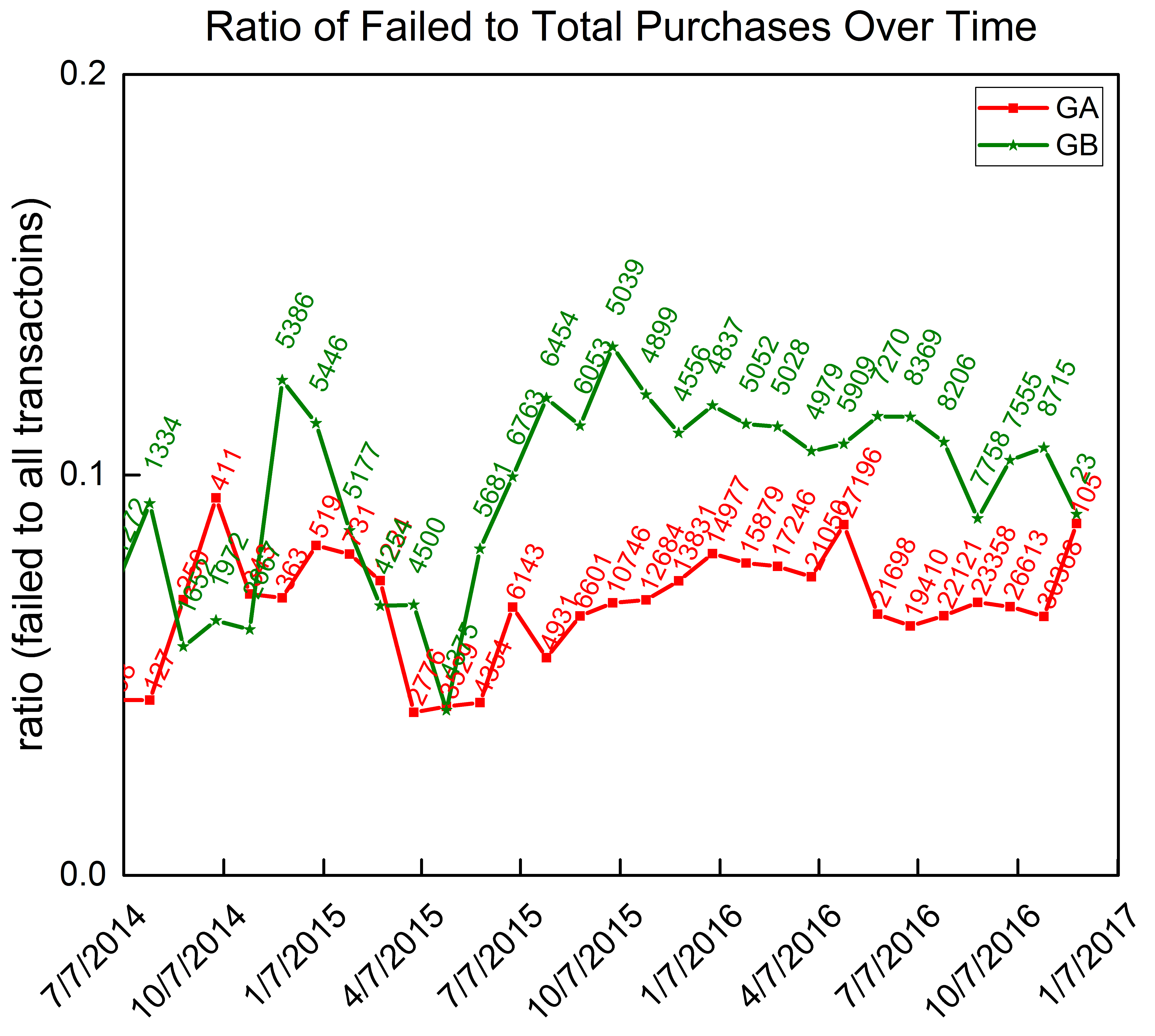 While the total decline rates is an important factor in evaluating a gateway’s performance, it is not a good measure to evaluate its performance over time. To see how the decline rate for GA and GB evolved over time, we plot the decline rates for purchases through these two different gateways in Figure 1. The numbers next to each datapoint represent the number of transactions through GA and GB for the particular months shown, respectively.