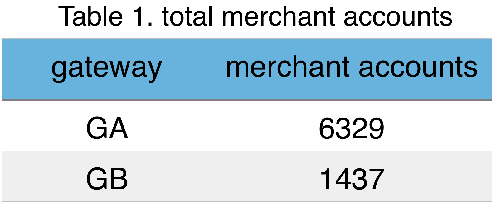 The total number of merchants actively using each gateway via Spreedly are given in Table 1. At the present moment, GA serves a larger pool of merchants, but both sample sizes are large enough that we were not worried about the data being skewed.