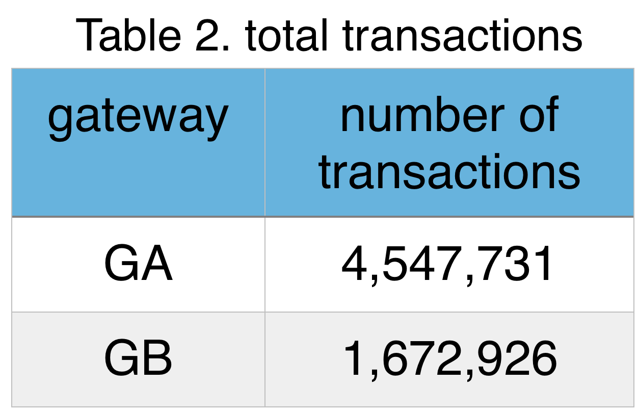 The total number of transactions for each gateways is given in Table 2. GA has transacted almost 3 times more than GB. This makes sense as currently GA is serving a pool of merchants 4 times bigger than the GB customers.