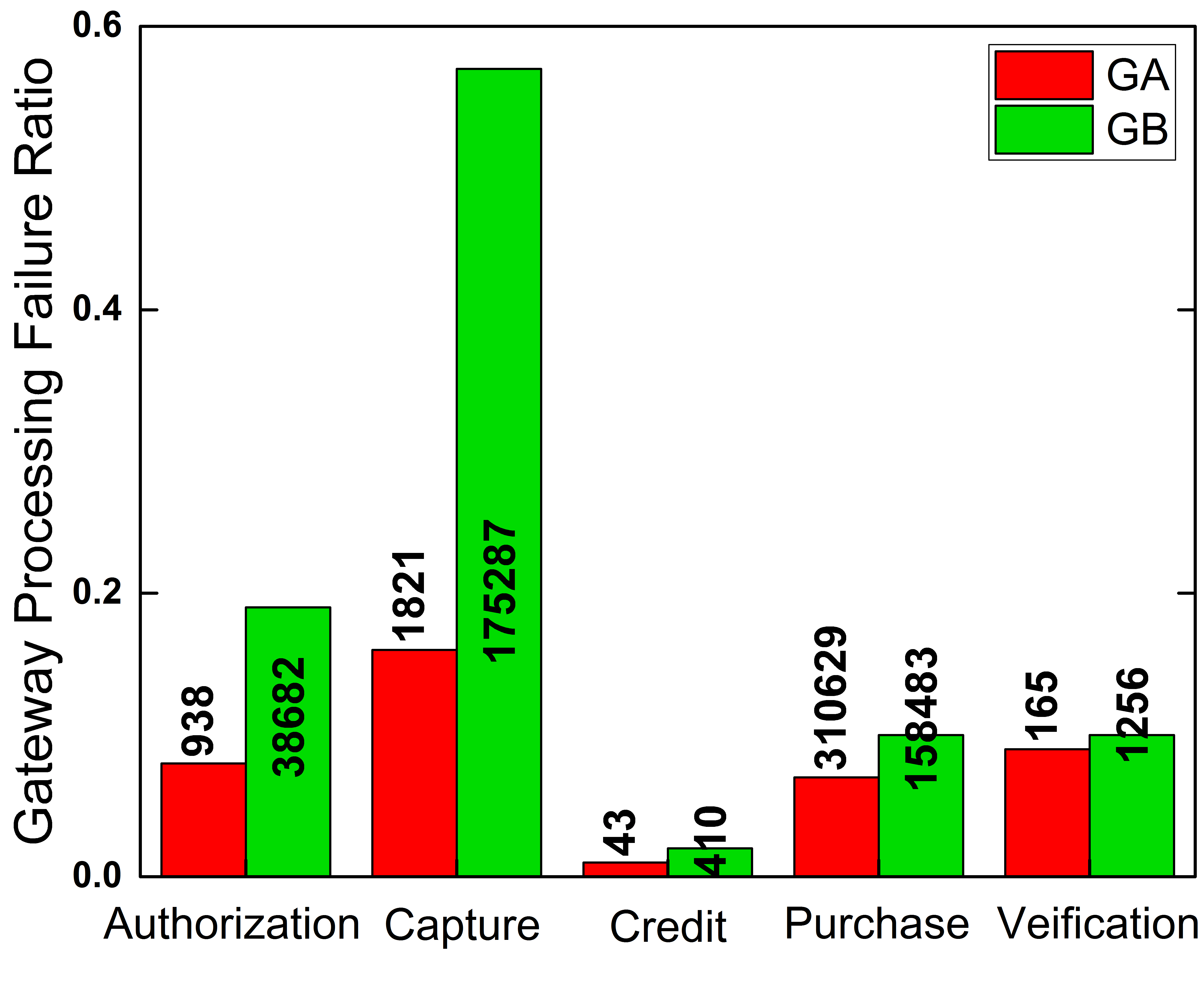 To better understand Figure 1, we need to note that GA is processing way more transactions than GB and at the same time, its failure ratio is lower in almost all transaction types. We also observe that while GB is transacting more authorizations, it also fails twice as much. GB's processing failed for capture is strikingly high.