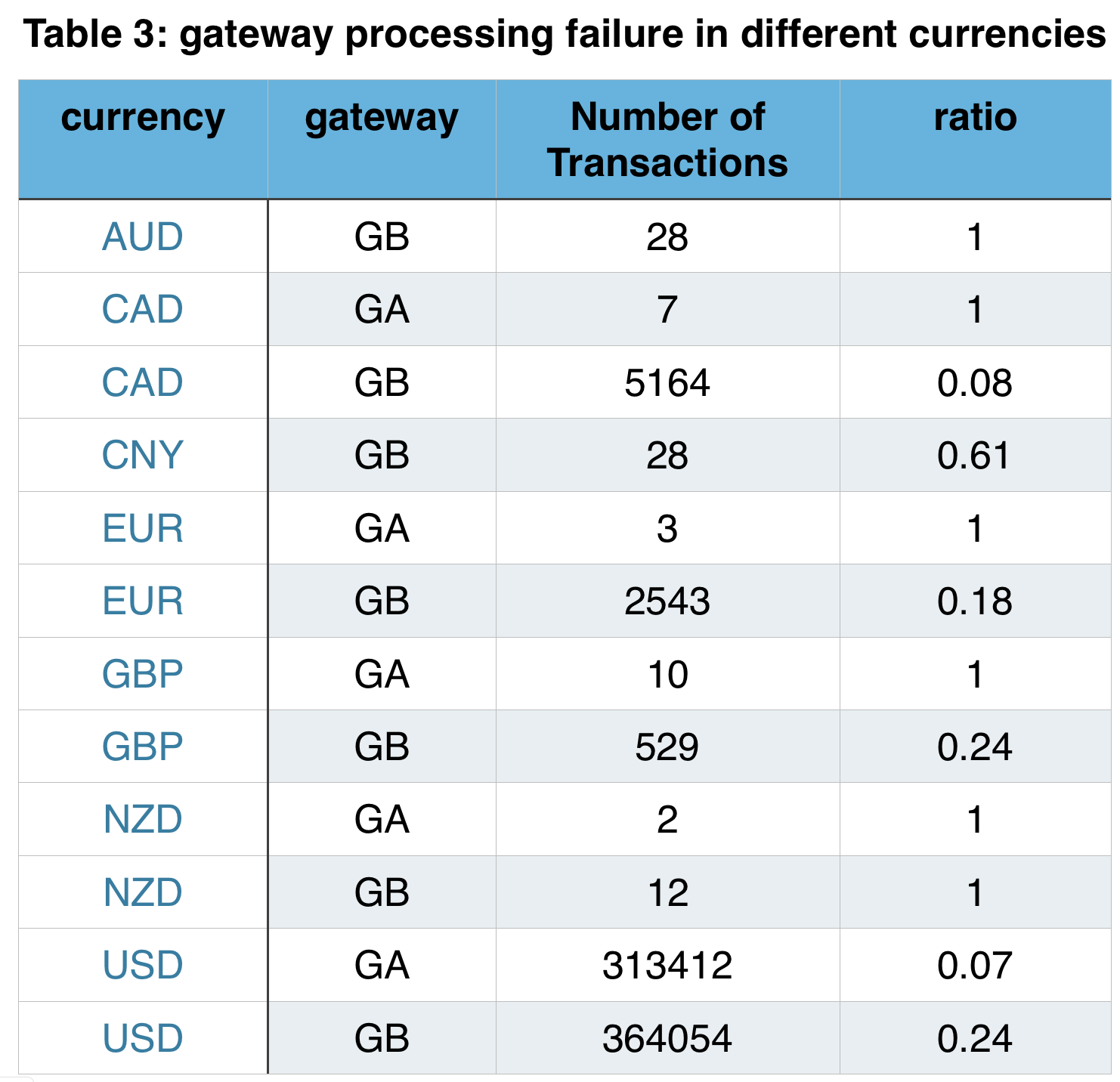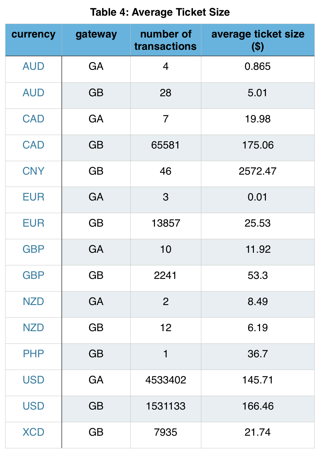 We have seen inquiries from customers where they are thinking of sending different size tickets to different gateways. This group will in particular find the average ticket size handled by each gateway, shown in Table 4, useful. It should be noted that for the sake of comparison the average ticket size in each currency has been converted to USD based on the rate of the date were the data were generated and analyzed. Considering the number and the average ticket size, GB stands out in CAD, CNY and GBP currencies while GA does a better job in USD, as mentioned before.