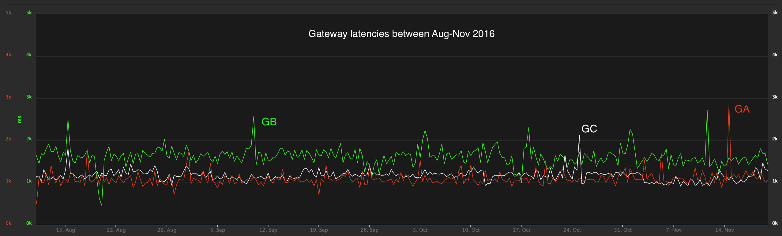 The response times of GA and GB are given in Figure 3 (for a better image quality please click on the figure). For comparison purposes, we have also added the latency of one of our premium gateways (GC). The latency data is plotted for the August to November 2016 time period. The vertical axis shows the latency time in milliseconds (1 mili second = 0.001 second).