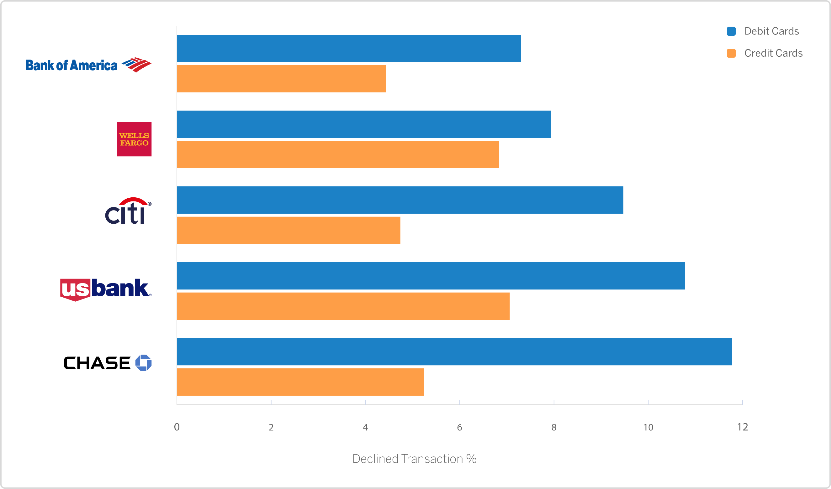 Bank of America tops both categories with a ~4% and a ~7% debit decline rate. At 1%, Wells Fargo represents the smallest difference between credit and debit decline rates.