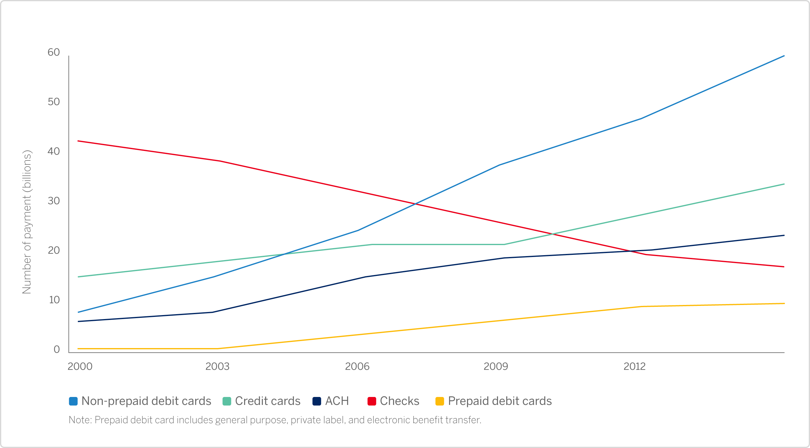 To see how consumers use their credit and debit cards, let's take a look at the most recent federal reserve report. The 2016 Federal Reserve Payment Report shows the growth rate of different payment methods, including ACH (Automated Clearing House) and checks, since 2000. Although the chart shows other payment methods, in this report we will only focus on credit and debit cards.