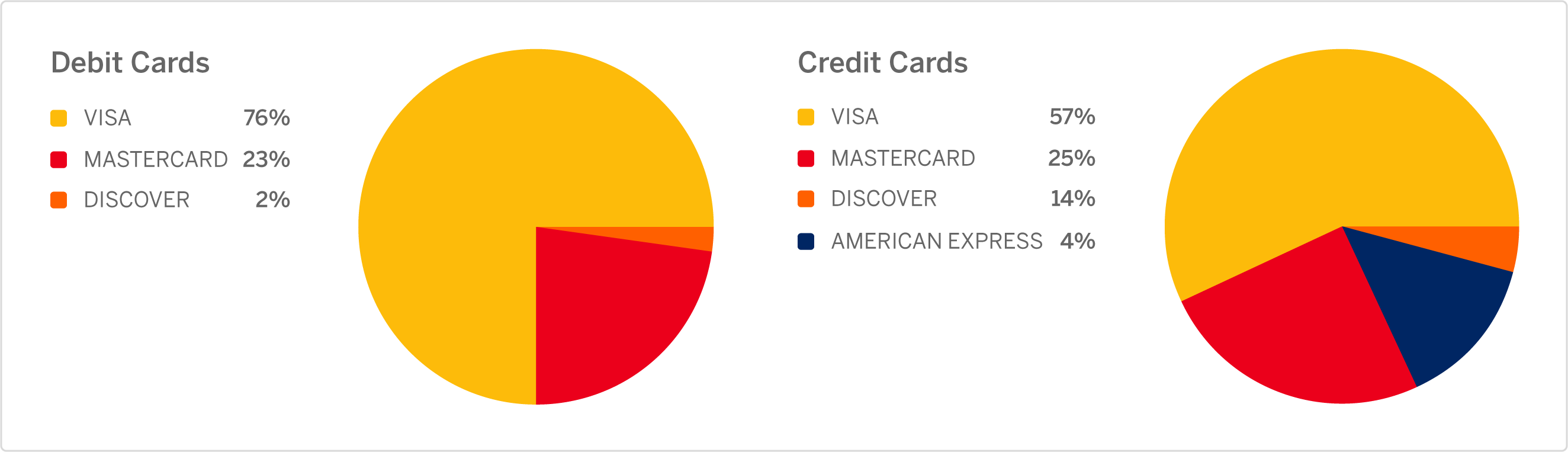 And while 14% of the credit cards belong to American Express (Amex), there are too few Amex debit cards to contribute to the pie chart (left).