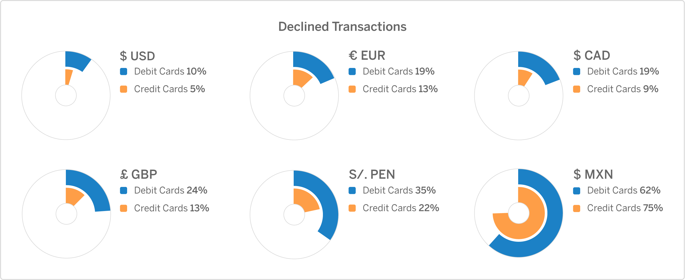 Investigating the payments made by US-issued cards in foreign currencies revealed that both credit and debit cards experience an increase in their declines compared to transactions in USD. And except MXN, credit cards are safer and more successful in transacting money in foreign currencies.