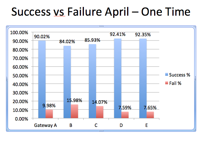 Success and Failures on one time transactions tend to trade in a much broader range. Here it seems the predicability of a recurring transaction actually helps. Maybe the card doesn't have a CVV, or maybe your customer forgot to have enough funds to cover the transaction. However, on these one time transactions the gateways/merchant accounts are applying much stricter fraud filters (after all, you're probably not going to be doing a bogus transaction on a monthly basis with a stolen card) Then the question becomes - are some doing a much better job than others? Or are some just accepting more fraud? Or is it the quality (or not) of merchant let in in the first place?