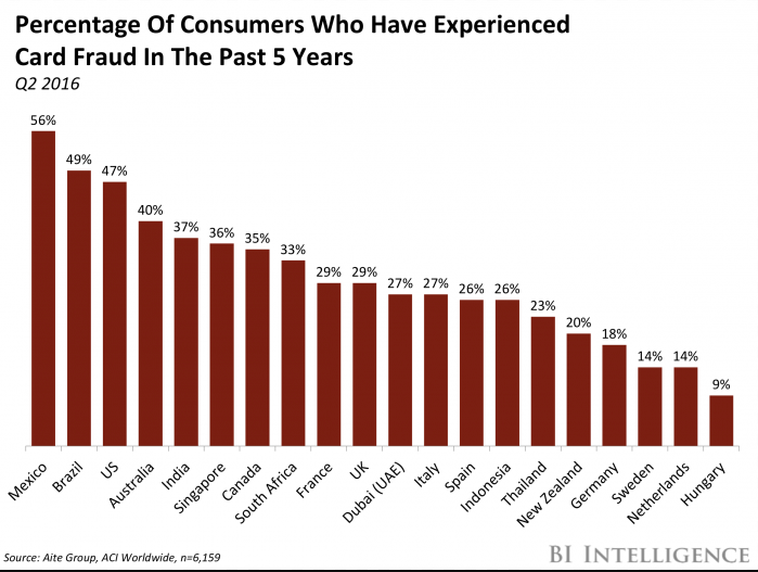 Credit card fraud rates are high in Mexico. Here is a chart showing consumers who have experienced credit card fraud, by country.