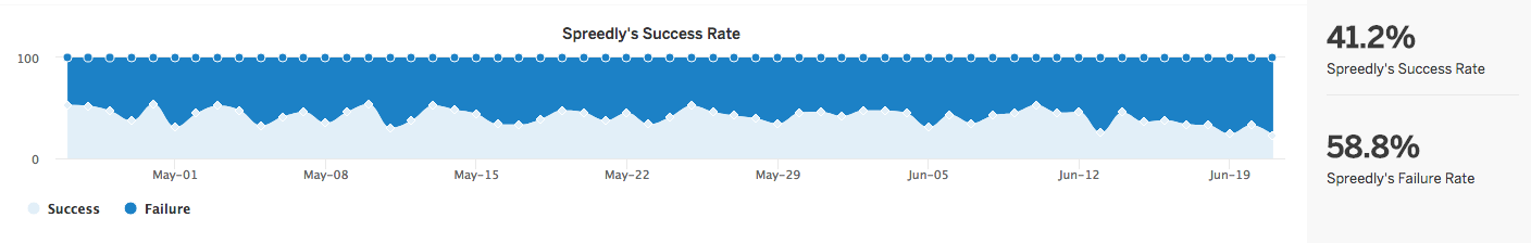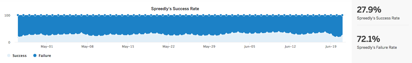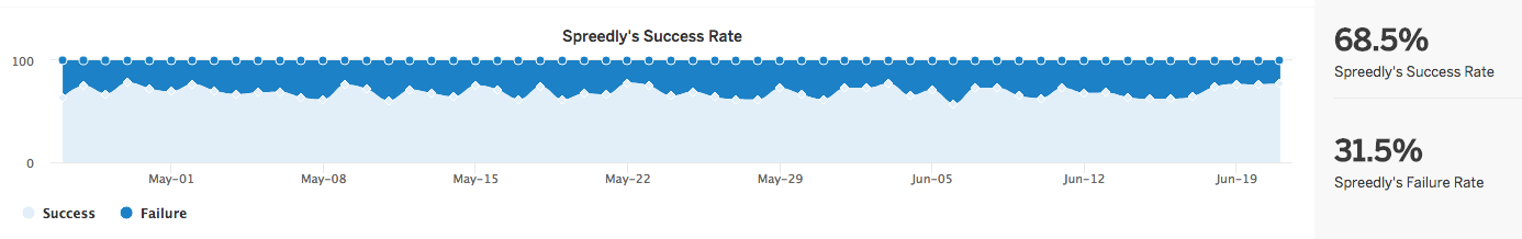 Spreedly collects a tremendous amount of payment related data- we capture metrics for over 100 payment gateway providers and third party API endpoints worldwide. Our tools allow you to better understand the absolute and relative performance of your payment gateway's key metrics, such as failed online credit card transactions.
