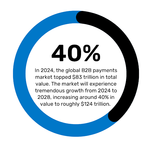 In 2024, the global B2B payments market topped $83 trillion in total value. The market Is forecast to experience tremendous growth from 2024 to 2028, increasing around 40% in value to roughly $124 trillion.