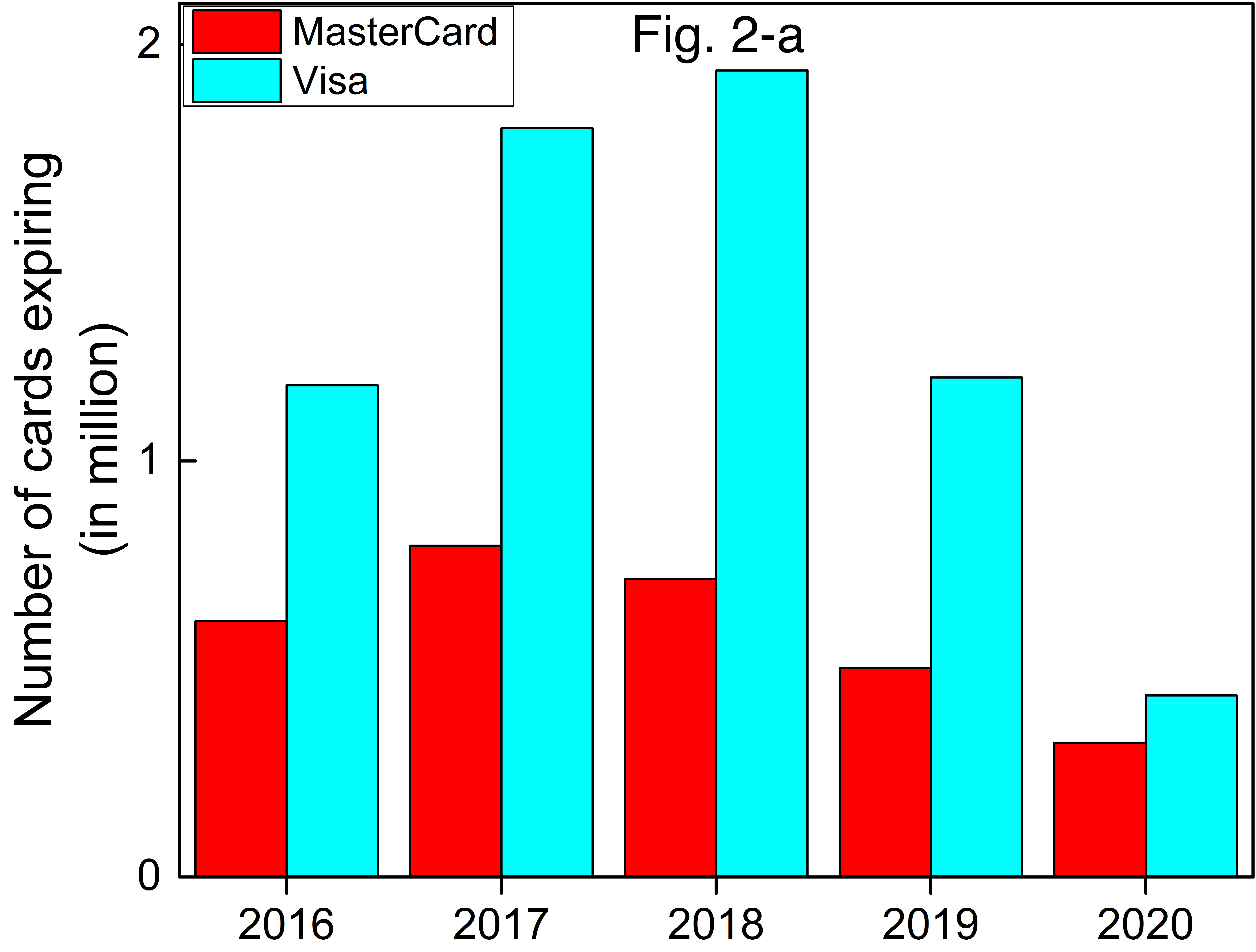 Even with our "fresh" vault, millions of these cards will expire in the next 24 months. Figures 2a and 2b demonstrates the total number of cards in the next 4 years: just in in 2017 and 2018 alone more than 4 million cards in Spreedly's vault will expire.