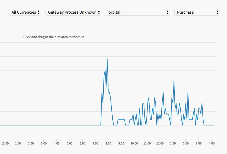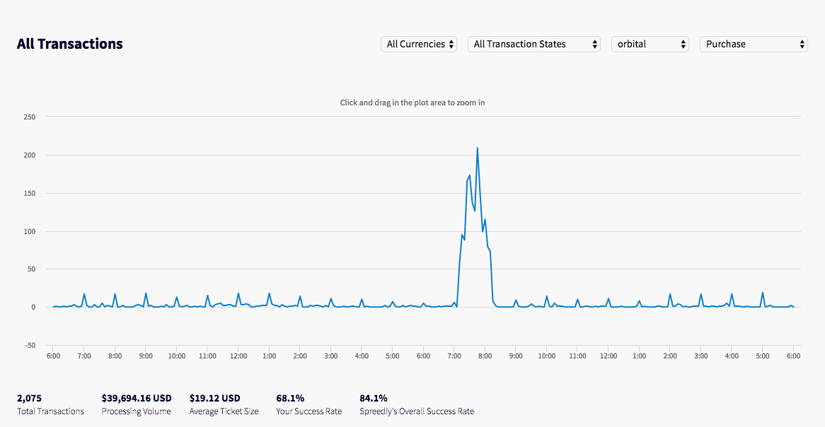 We contacted Orbital. They were aware of the problem and working on a fix. In this case, Insights ensured our customers could quickly check the status of their payment gateway and understand exactly when the issues started and stopped. One of the major benefits of Spreedly, transacting against multiple payment providers, comes into play here. By seeing up-to-date payment gateway data our customers can switch to a backup provider and decide when to switch back based on tracking gateway performance in real time.